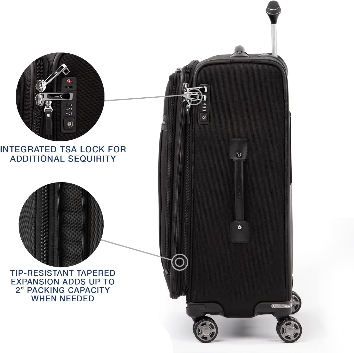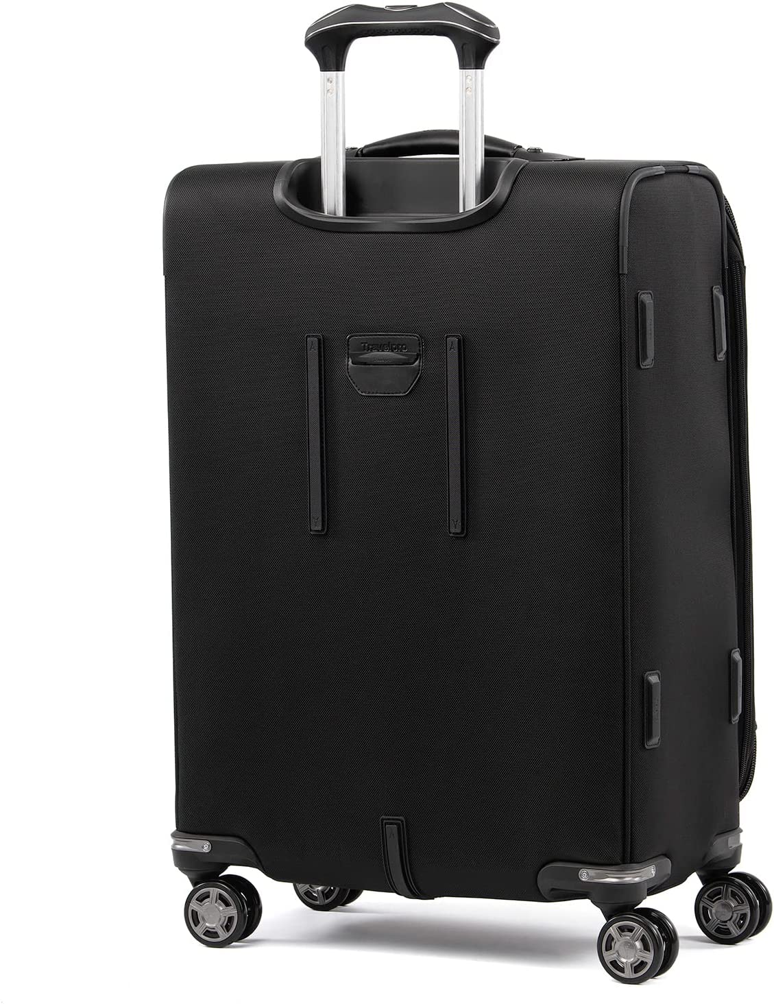 Finally, great looking checked luggage that is as functional and durable as it is stylish. The Platinum Elite 25" Expandable Spinner is perfect for medium and long trips, accommodating everything you need, guarding against wrinkles with a built-in suiter and keeping everything organized under a deluxe tie-down system with integrated accessory pockets. Constructed with premium fabrics, leather accents and chrome zippers, this gorgeous bag also features a tip-resistant tapered expansion option that provides up to 2" additional packing capacity. Integrated lock allows TSA authorities to safely unlock and lock suitcase for inspection when needed (default lock code is 0-0-0 to open). For effortless mobility, this 25" suitcase is equipped with our Precision Glide system-eight MagnaTrac, self-aligning, 360-degree spinner wheels guided by an adjustable PowerScope extension handle with patented Contour Grip and rubberized touch points, ergonomically designed to be easy on the hands. Backed by Travelpro built for a lifetime limited warranty with our trusted companion promise which covers the cost of repair for damage from airline or other common carrier for 1 year.