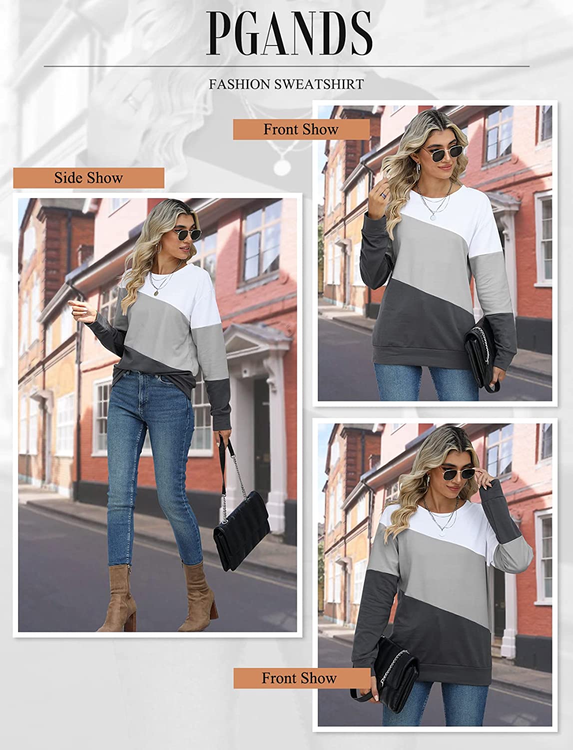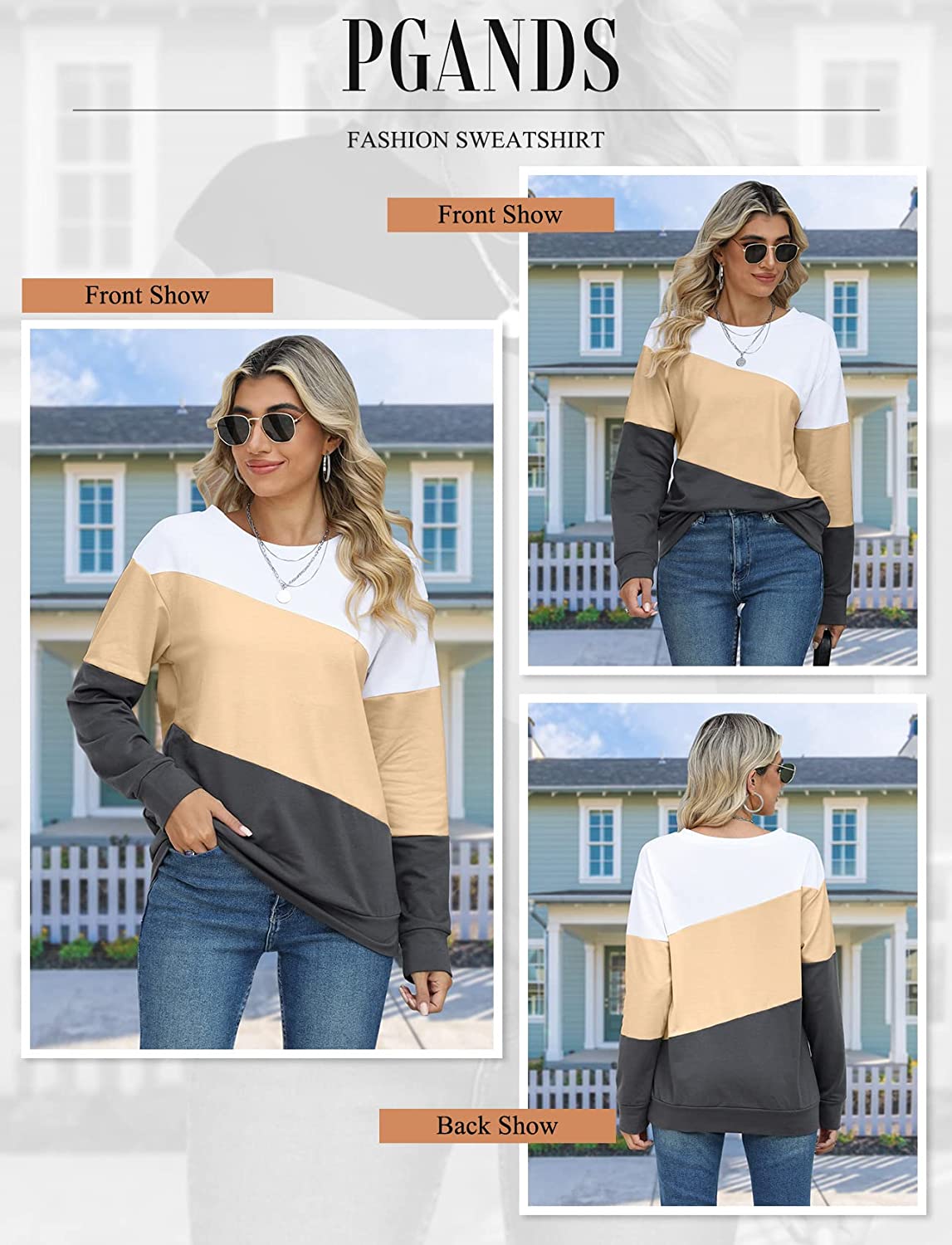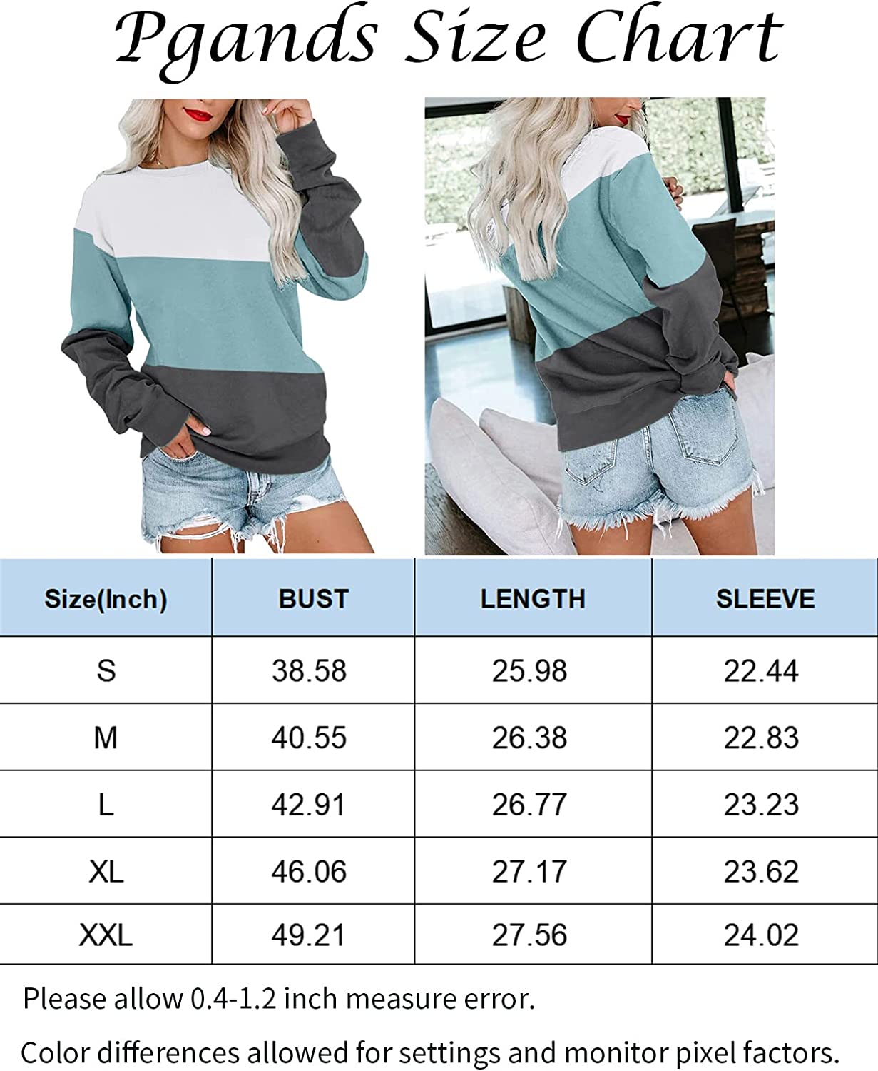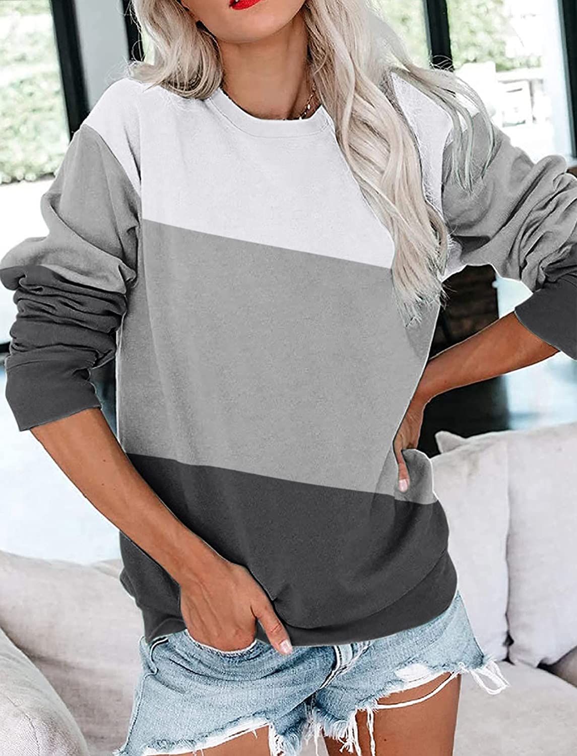 PGANDS Womens Crew Neck Color Block/Solid Sweatshirts Tops Long Sleeve Casual Pullover Cute Lightweight Loose Tops