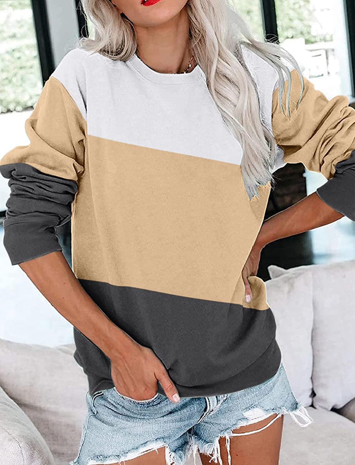 • 【Easy To Match】This eye catching fashion color block fall tops is designed for women and juniors. The material is not thin and thick, easy pair it with skinny jeans/ jeans/ leggings/ coat/ jackets/ sneakers/ boots/ heels,etc. Rock this sweatshirts hoodie with the pair of jeans and sneakers for a charming choice!