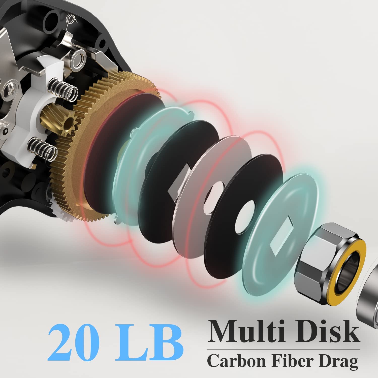 • Powerful Drag System - The smooth and powerful drag system utilizes the multi disk carbon fiber drag washers which the max drag can reach up to 20lbs. It helps stop those big fish from running into cover and getting away.