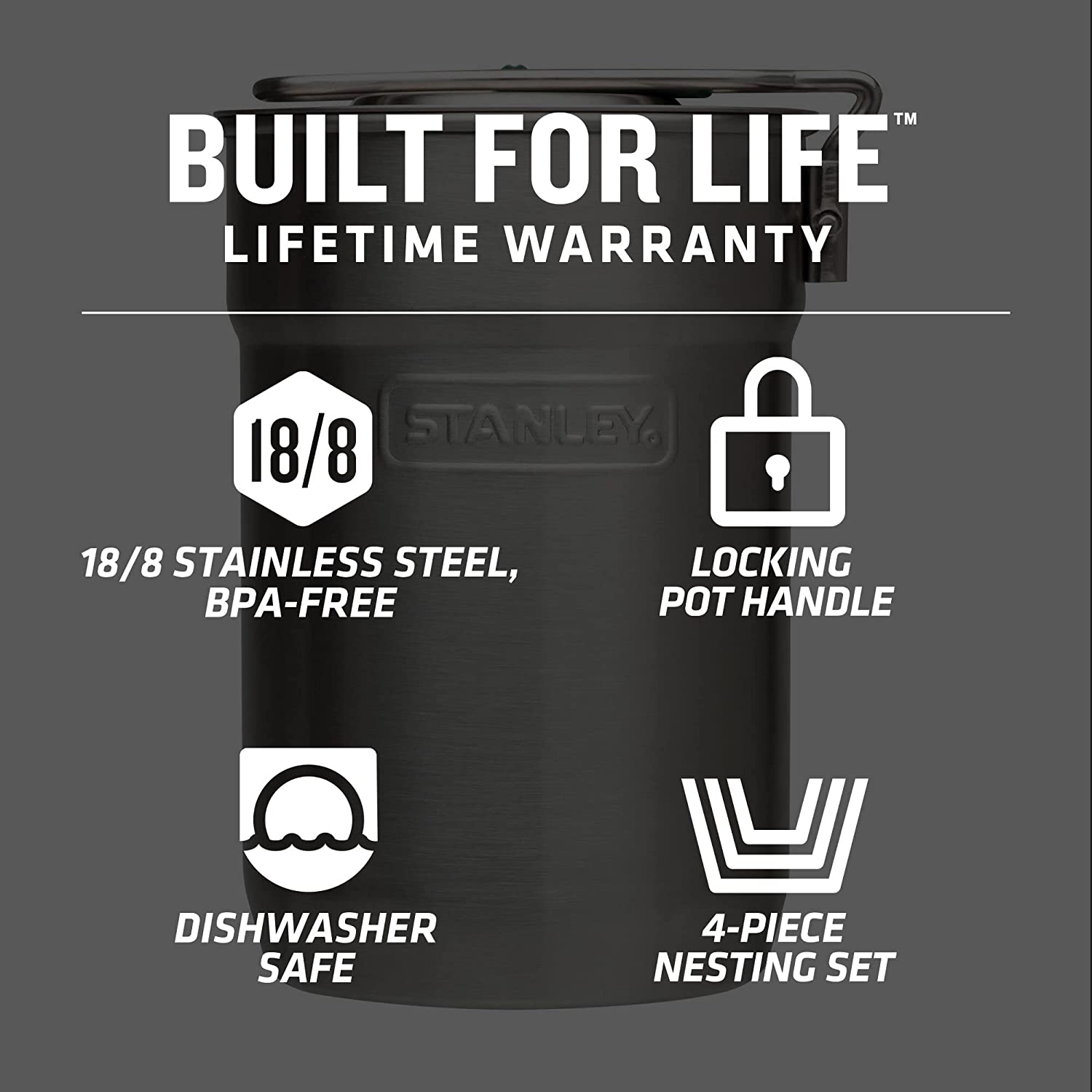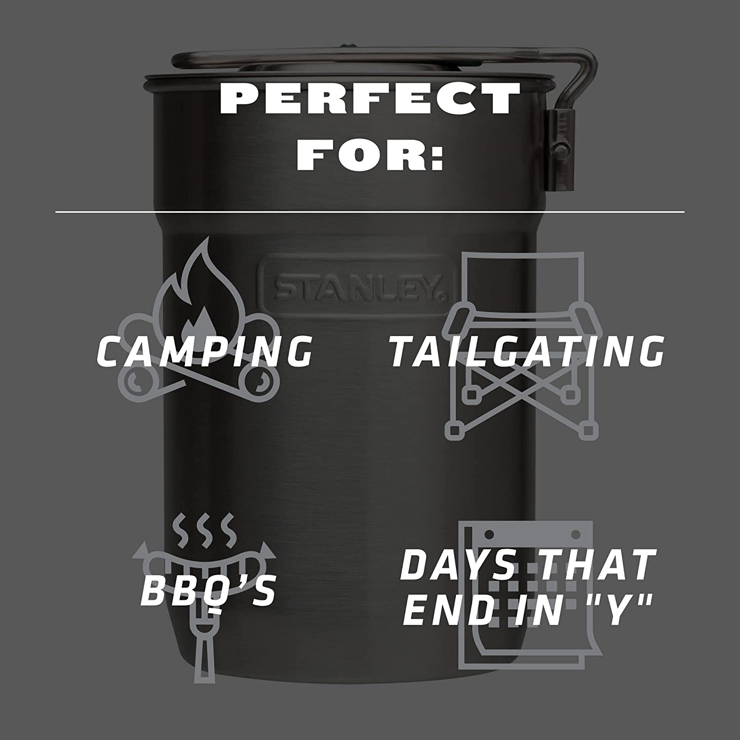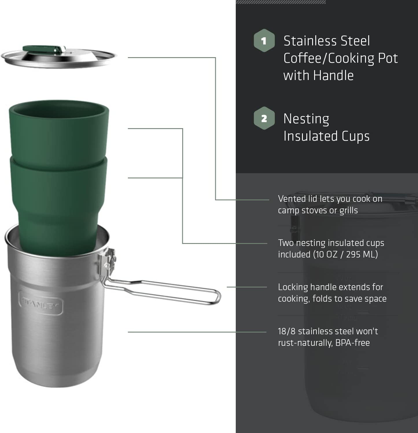 • IDEAL OUTDOOR ACCESSORIES: The Stanley cook kit is perfect for outdoor cooking for hot meals, coffee, or boiling water Our cooking pots come with a vented top to let steam escape or strain liquid This is a great survival supplies gift too
