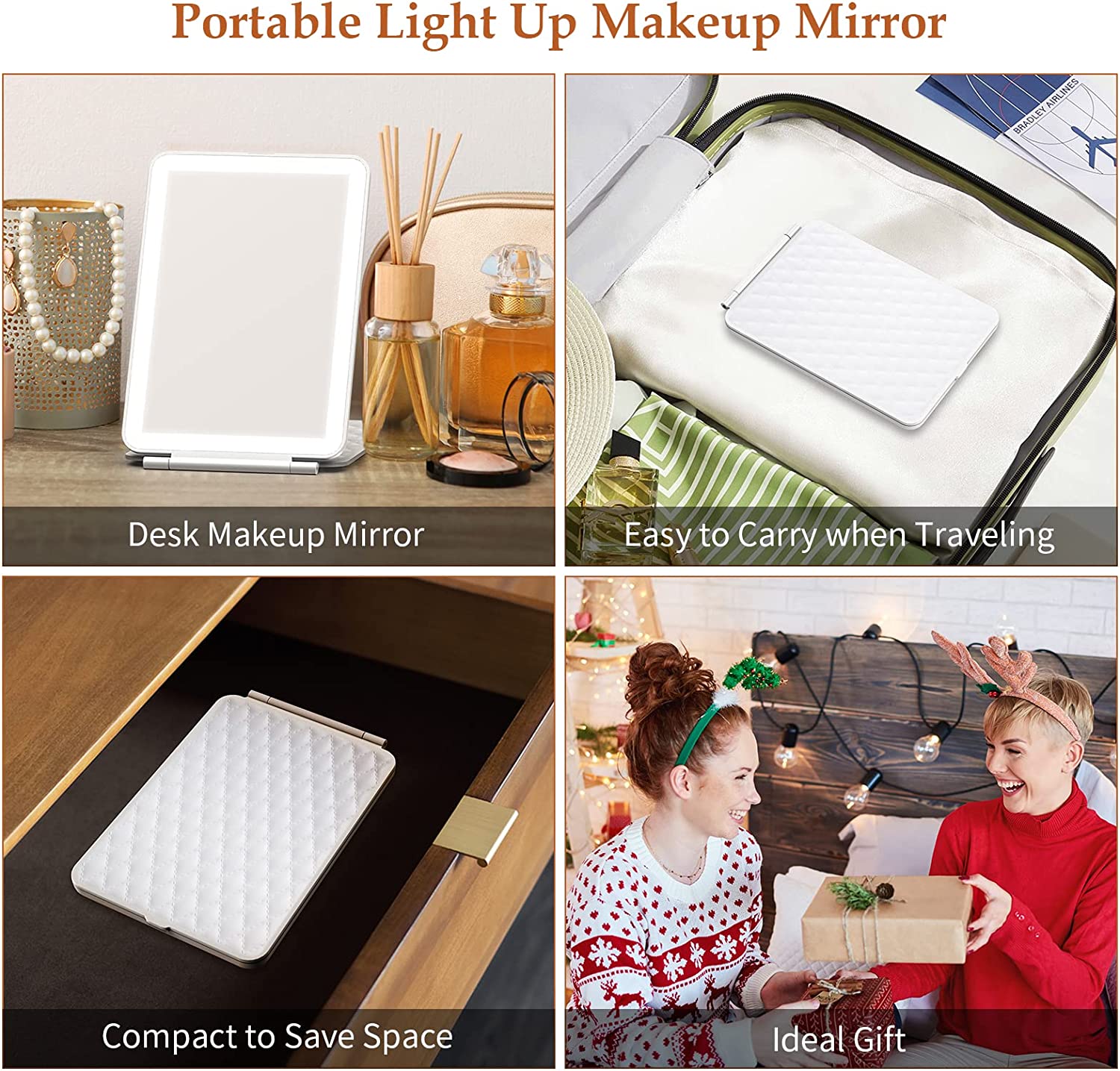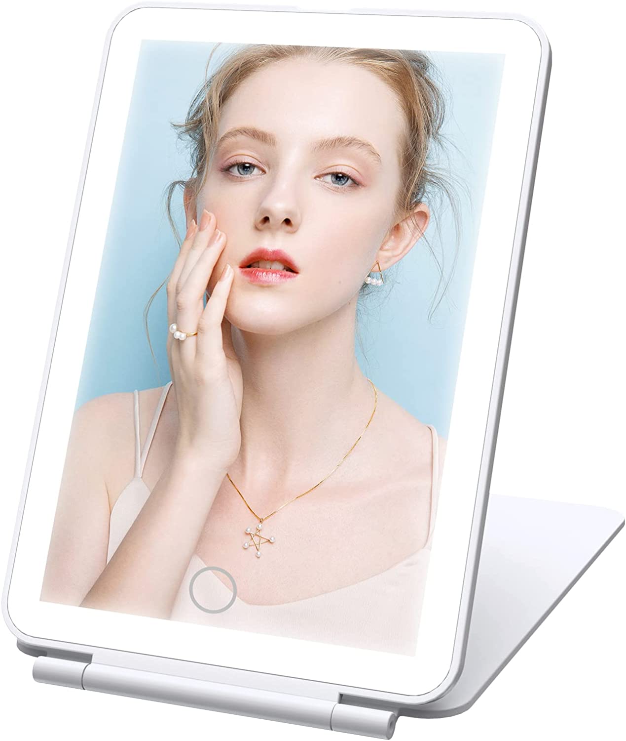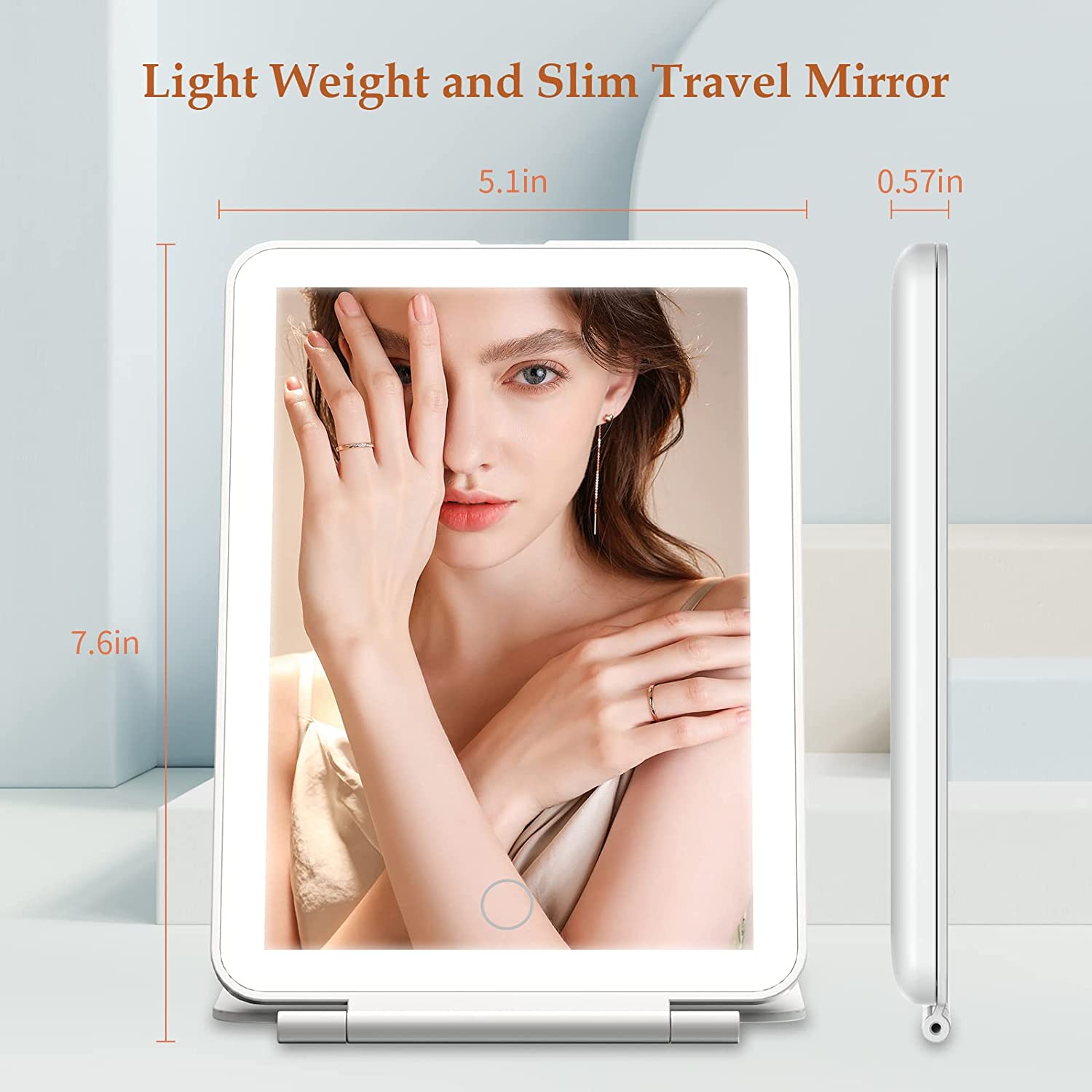 • ?️【??????? ???? ??? ??????】Our compact travel mirror with light is designed ultra slim, lightweight and portable.The overal size of this vanity mirror is about 5.1 x 7.6 inch, 0.57 inch thickness when folded, only 0.57 pounds, similar as iPad mini size. It's easy to slip this light up mirror into your handbag or lugguage, and you can take it everywhere for perfect travel use conveniently.