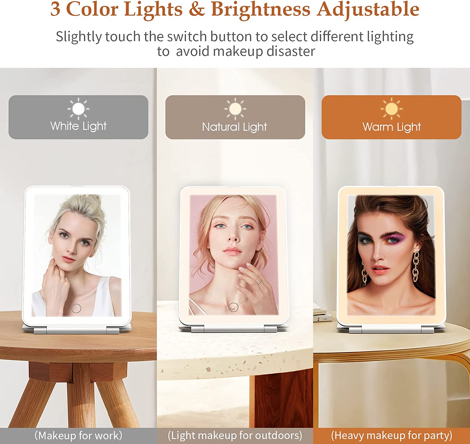 • ?【? ????? ???????? ?????? ??????】This portable lighted makeup mirror is built in 72 bright LED lights, natural and soft, bright but not dazzling. It provides you with perfect viewing while applying makeup in dark or poorly lit areas. The led mirror offers 3 color lighting modes, easily switch among warm lighting, natural lighting, cold lighting, allowing you makeup in various lighting situations.