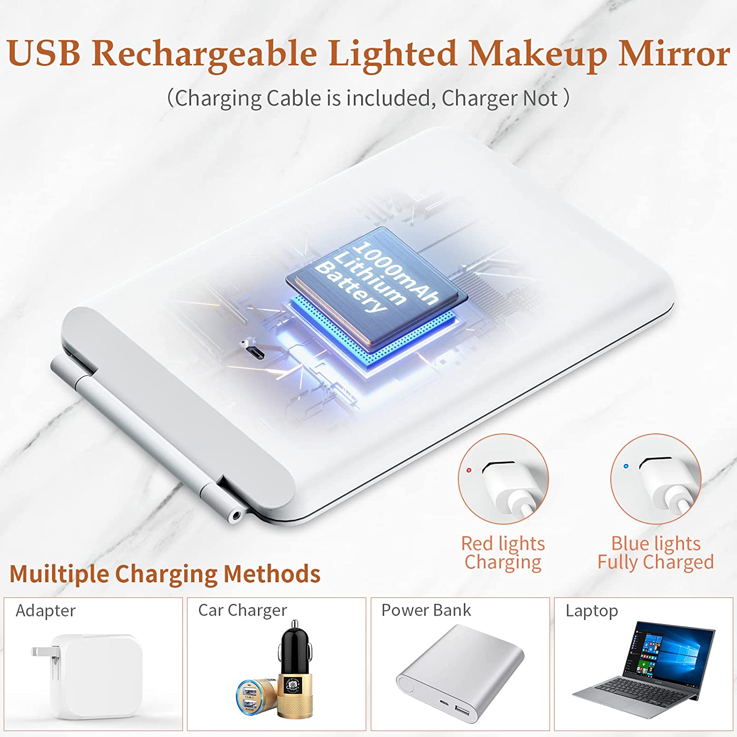 • ?【???????????? ?????? ?????? ??????】This travel mirror with light has a built-in 1000 mAh rechargeable lithium battery, continuously works for up to 1.5 hours after fully charged. It can be charged through USB by powerbank, PC, etc. No need to charge frequently or change batteries anymore, very convenient to take everywhere.(Charging cable is included, charger not)