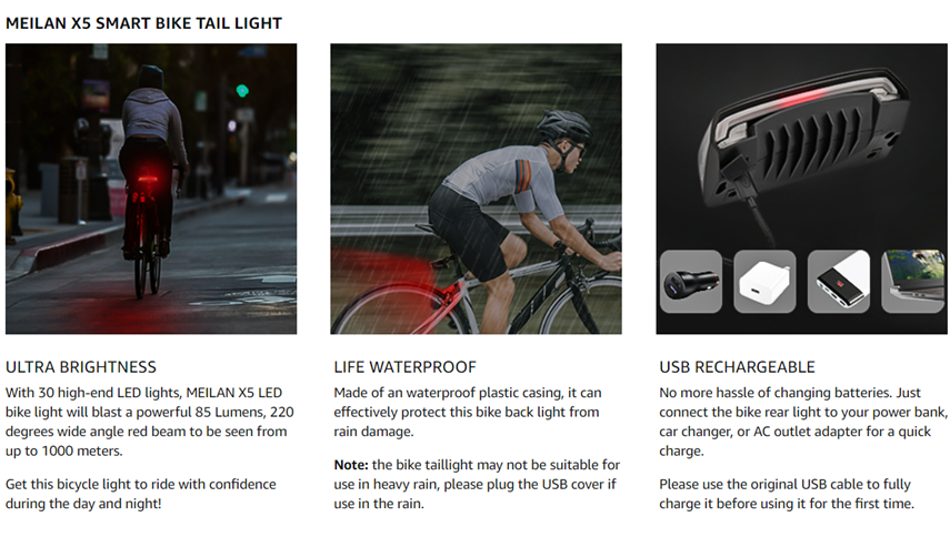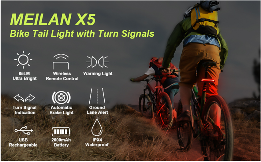 • ?【ULTRA-BRIGHT LED BIKE TAIL LIGHT】MEILAN X5 bike tail light have 30 high-end LED lights and the brightness up to 85 LM, it’s bright enough to be seen from 150ft away in foggy/rainy day or even in dark night.