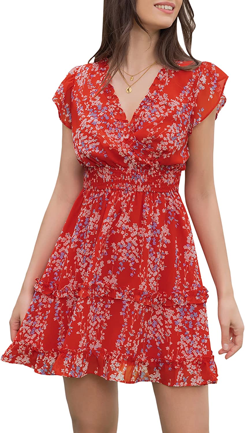 EXLURA Women's Summer Flowy Mini Dress Floral V Neck Short Ruffle Sleeve Smocked Cottagecore Vacation Dress