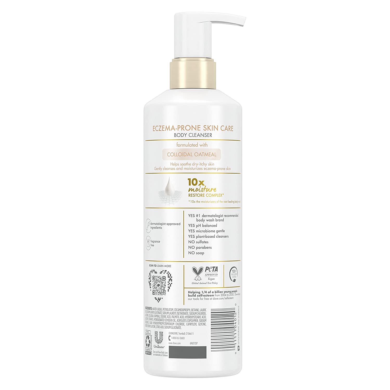 Care for your skin condition now starts in the shower with the Dove Body Love Eczema-Prone Skin Care Body Cleanser with Colloidal Oatmeal to help soothe dry-itchy skin. The paraben-free and sulfate-free body wash is made with plant-based cleansers and 10x Moisture Restore Complex* to transform even the driest skin in just one shower. How To Use: Squeeze a generous amount of Dove Dry-Cracked Skin Replenish Body Cleanser into your palms, or onto a loofah. Naturally, derived cleansers help this body cleanser create a luxurious lather. Smooth the gentle body wash formula over your body and allow the light lather to caress, smooth, and hydrate skin. Rinse with warm water to reveal skin that feels moisturized, smooth, and soft. This body cleanser is Certified PETA VEGAN, and is made in 100% recycled plastic bottles, so you can feel good about switching to Dove. At Dove, our vision is of a world where beauty is a source of confidence, and not anxiety. So, we are on a mission to help the next generation of women develop a positive relationship with the way they look—reaching over ¼ of a billion young people with self-esteem education by 2030. We are also committed to a landmark new initiative as part of our 2025 commitment to reduce plastic waste; reducing over 20,500 metric tons of virgin plastic annually by making the iconic beauty bar packaging plastic-free globally; launching new 100% recycled plastic bottles; and trialing a new refillable deodorant format that radically reduces plastic use. As one of the largest beauty brands in the world, we are revealing an agenda setting commitment to tackle the global beauty industry’s plastic waste issue. *10x the moisturizers of the next leading body wash.
