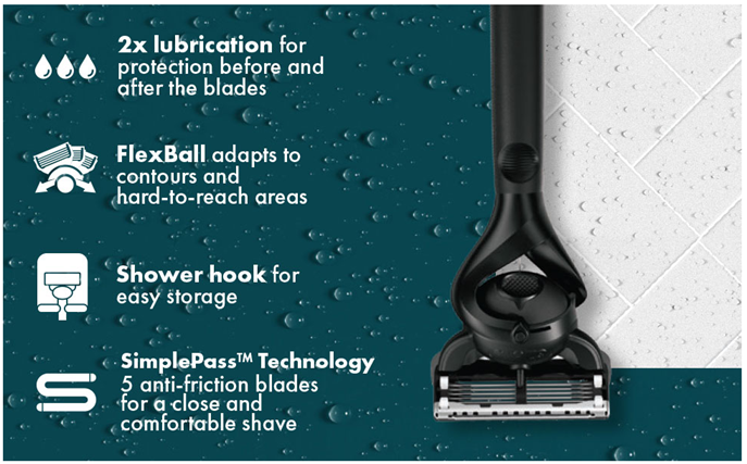 • 2x LUBRICATION: Positioned before and after the blades to add a protective layer to skin. Features a fully rubberized non-slip handle for an easy grip in the shower