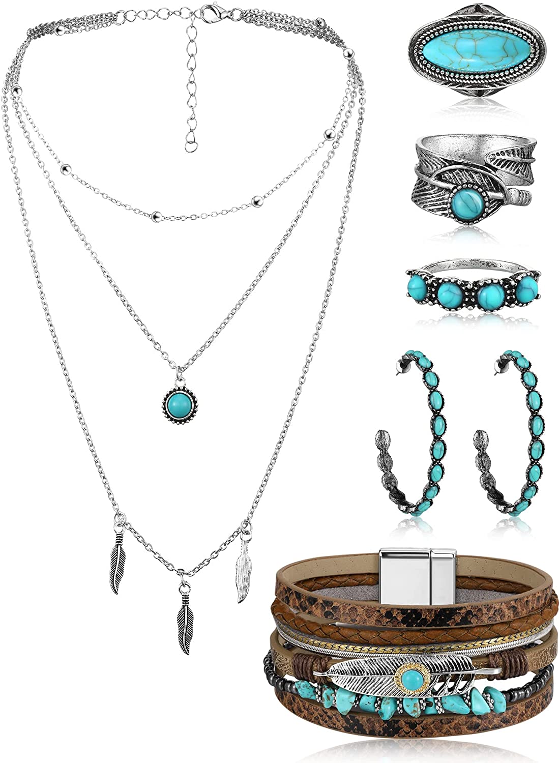 Package Includes: the package will come with 6 pieces of turquoise jewelry for women, including a piece of turquoise faux leather layered bracelet, a pair of turquoise dangle earrings, a piece of turquoise pendant necklace and 3 pieces of turquoise finger rings, good collocation to meet your wearing, matching and replacement needs