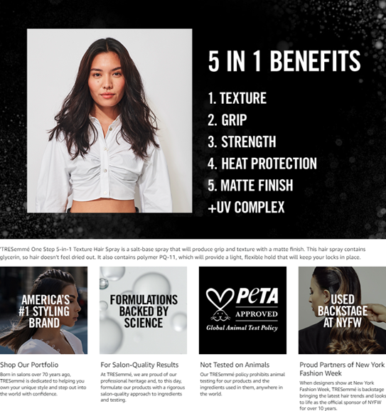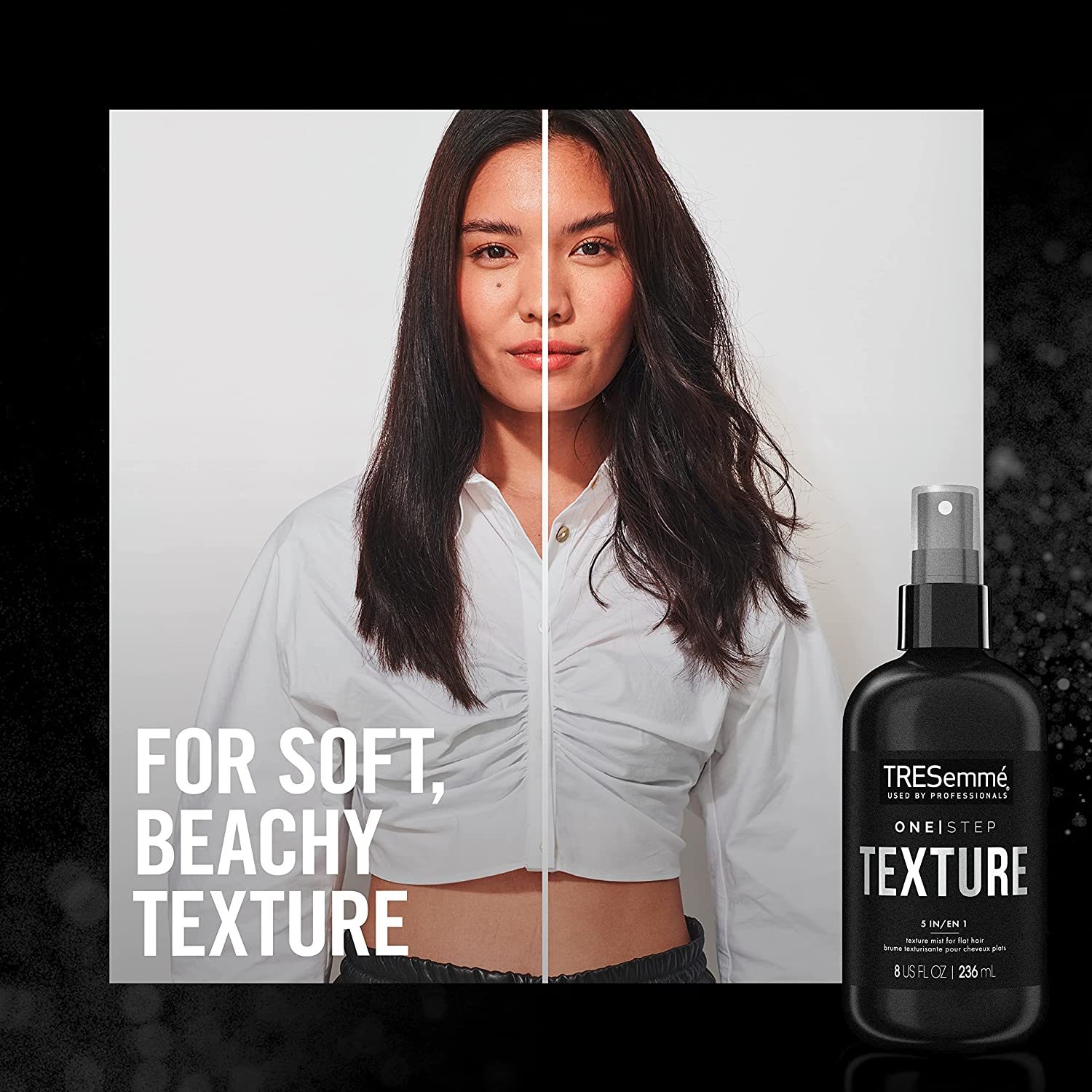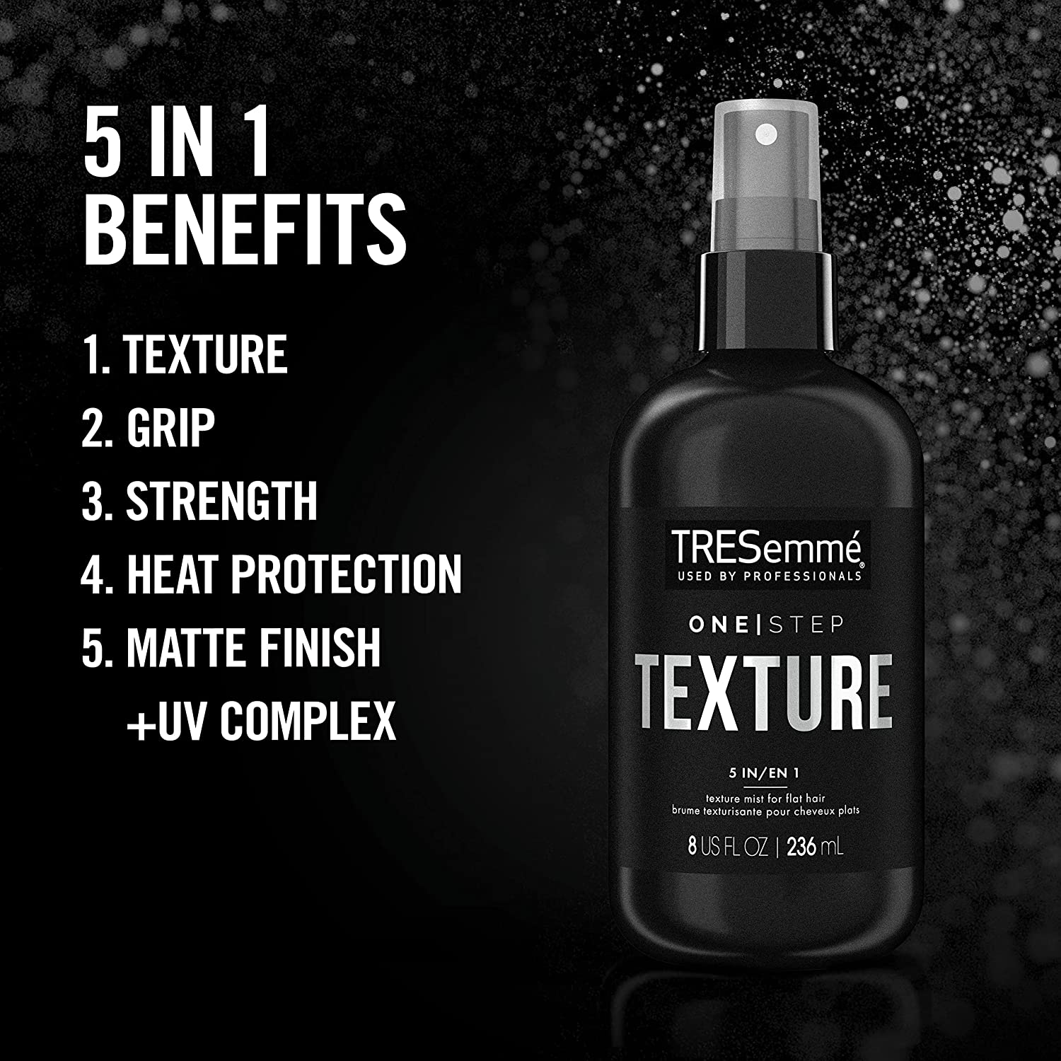 • 5-IN-1 BENEFITS, ONE PRODUCT: TRESemmé One Step 5-in-1 Texture Mist is a hair texture spray that delivers grip, strength, texture, and heat protection with a matte finish!