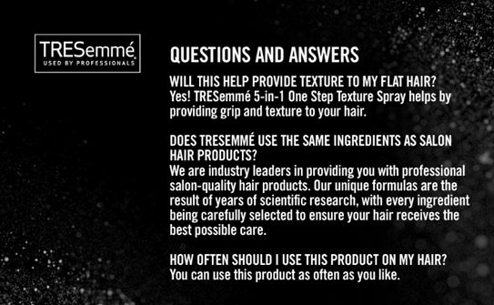 • SALON QUALITY, RIGOROUSLY TESTED: Ingredients in our hair styling hair texture spray are carefully selected for professional results. TRESemmé is proud to be PETA-approved