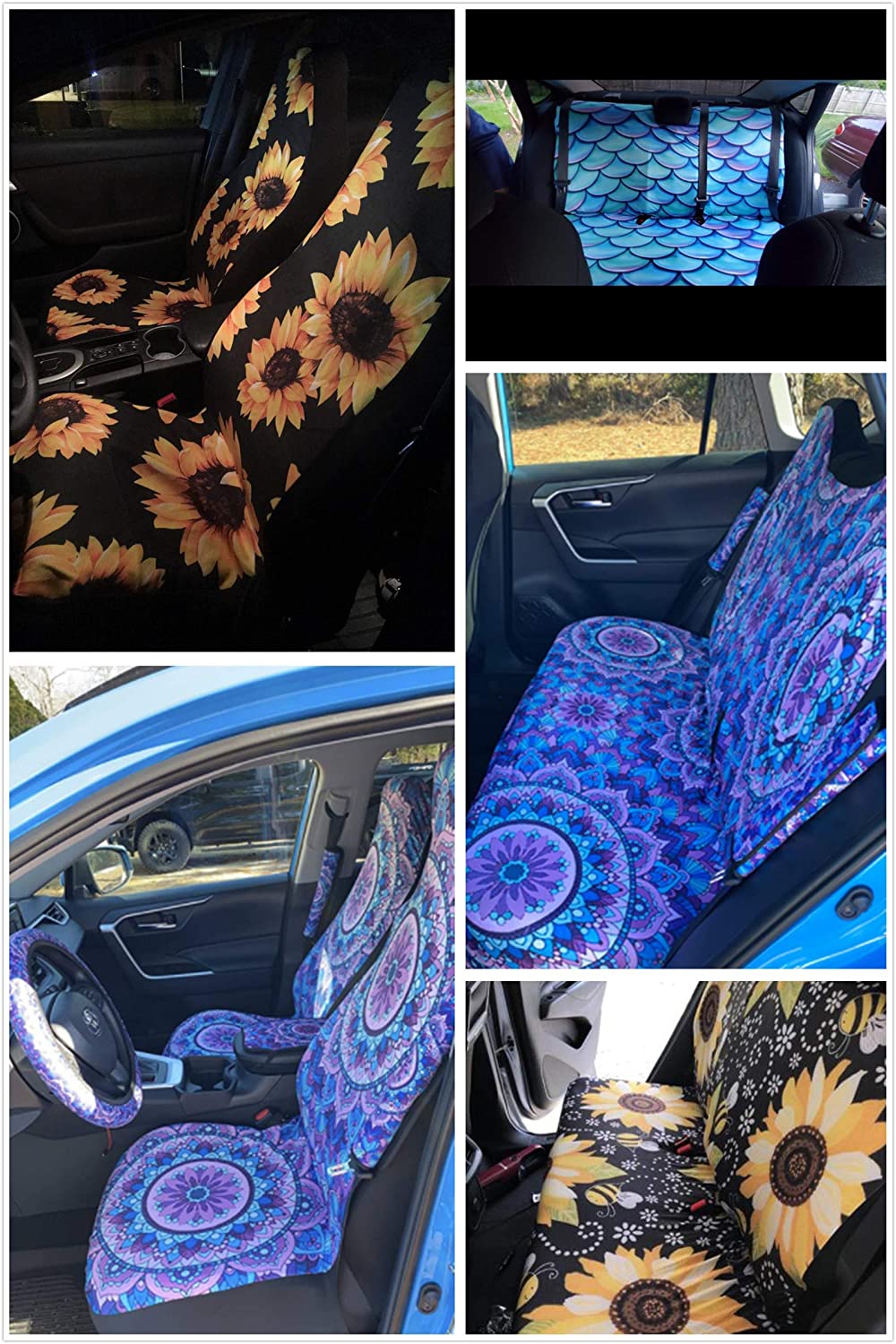 ❤ 11 Pack Car Accessories Interior Protector ❤ Car Seat Covers Full Set: Include 2pcs front seat cover. 1pc rear backrest cover, 1pc rear bottom bench cover. Broad compatibility, fit most seats with built-in or adjustable headrests; Non Slip Backing: Traction Support Prevents the Covers From Sliding or Slipping Around. ❤ Car Steering wheel Cover: Suitable for most steering wheels: It can be stretched to fit a standard steering wheel with a diameter of 14-15 inches. The fancy steering wheel cover is one of the most appreciated car accessories for women, men. ❤ Car Seat Belt Pad: It can be used in cars, trunks, SUV, airplanes, but also in handbags, baby diaper bags, golf bags, camera bag, diaper bag, laptop case bag, suitcases with straps and anywhere you want to pad comfortably ( Size: 11.7 x 8.5 Inch, 2 PCS). ❤ Cup Coasters & Keyring: Cup Mats Size: 2.8 x 2.8 inch; Key Chain Size: 1.8 x 2.6 inch. ❤ Notice: Please allow 1 inch/2cm difference due to hand measurement.