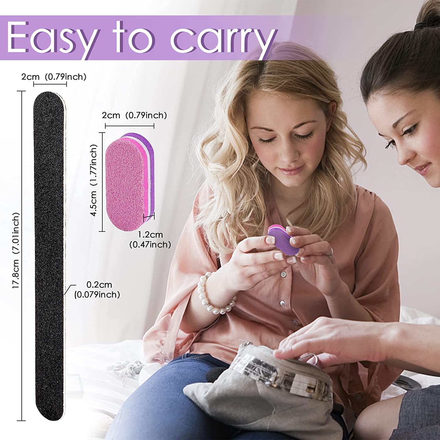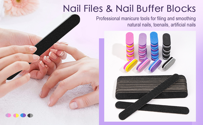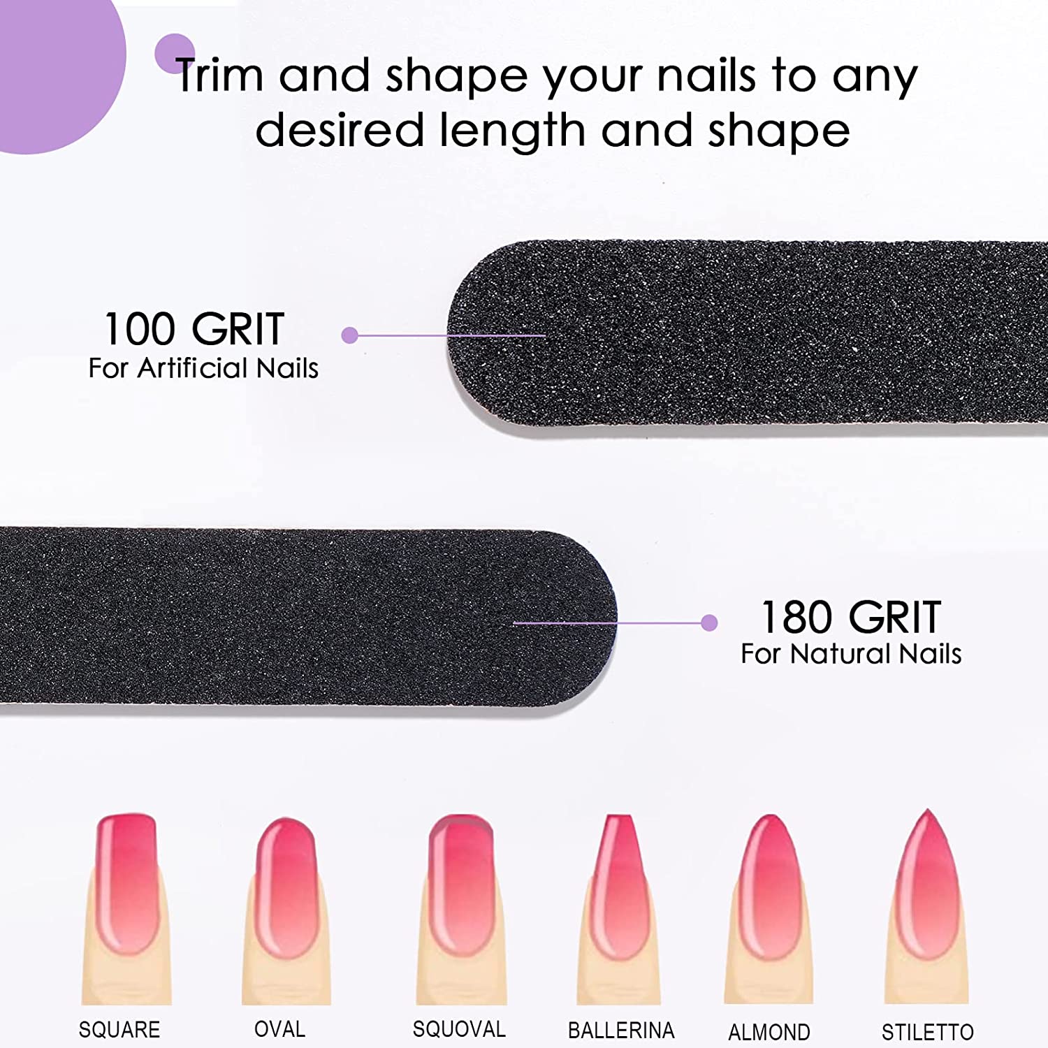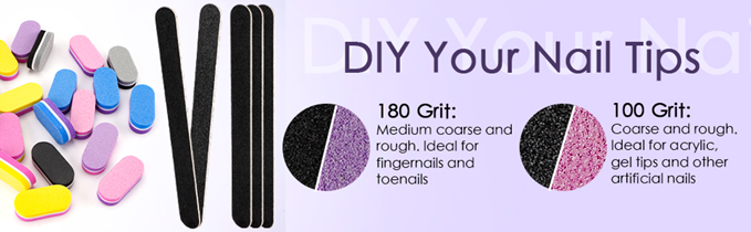 • 100/180 Grit Nail File and Buffer Set: The double-sided emery boards for nails and buffer blocks are 100/180 grit to meet different uses. 100 grits is suitable for coarse grinding, suitable for hard nails, toenails as well as artificial nails. 180 grit is suitable for fine grinding, suitable for finely finishing the edges of nails.