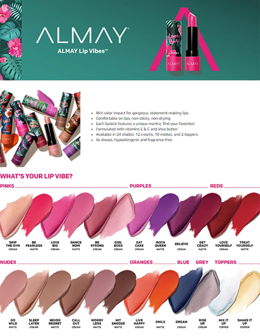 - Formulated with vitamins E and C and Shea Butter. Available in 24 shades: 12 creams, 10 mattes, and 2 toppers. As always, Hypoallergenic, Fragrance-free