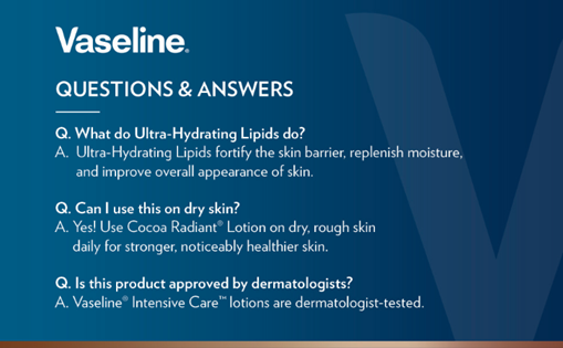 Vaseline Intensive Care Cocoa Radiant Lotion, with Ultra Hydrating Lipids and Pure Cocoa Butter, moisturizes skin for a long-lasting, radiant glow. This body moisturizer is clinically tested to provide 90% more moisture (vs. untreated skin).