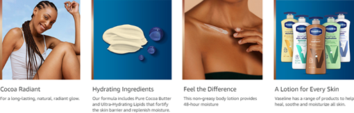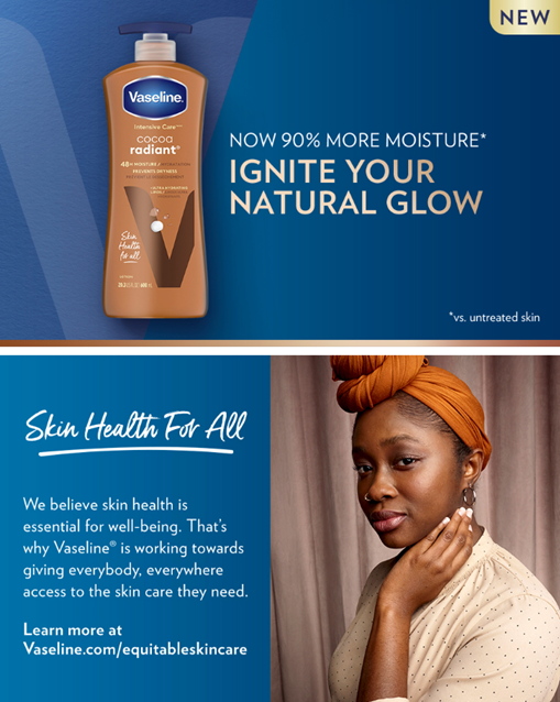 Made with Pure Cocoa Butter and Ultra-Hydrating Lipids, Vaseline Intensive Care Cocoa Radiant body Lotion for dry skin prevents dryness and helps keep your skin looking healthy and hydrated. With daily exposure to environmental triggers (like wind, lack of humidity, and sun), skin's natural moisture barrier can break down, allowing water to escape the skin. But the Ultra-Hydrating lipids in our Cocoa Radiant lotion fortify the skin barrier and replenish moisture to allow the skin's natural barrier to recover. Vaseline Intensive Care Cocoa Radiant Lotion, formulated with Ultra-Hydrating Lipids and Pure Cocoa Butter, moisturizes skin for a long-lasting, radiant glow. This body moisturizer is clinically tested to provide 90% more moisture (vs. untreated skin). This body lotion for dry skin absorbs fast for rich moisturization without the residue and provides 48-hour moisture. Use this dermatologist-tested body lotion daily on dry, rough skin for stronger, noticeably healthier skin. Just apply to your skin for long-lasting moisture. This Vaseline lotion bottle is made of 50% recycled plastic. Our ambition is to get to 100% recycled plastic in the near future. Since 2018, we've used 337 Metric Tons of recycled plastic across the Vaseline product portfolio in North America.