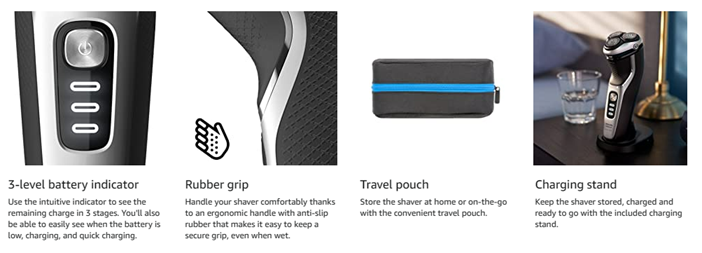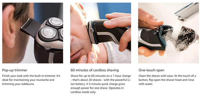 • Enjoy a clean shave that follows your face's contours with 5-directional pivot, flex and floating movements. The head reaches your face at the ideal angle and adjusts to the curves of your face and neck, creating smooth contact with your skin.