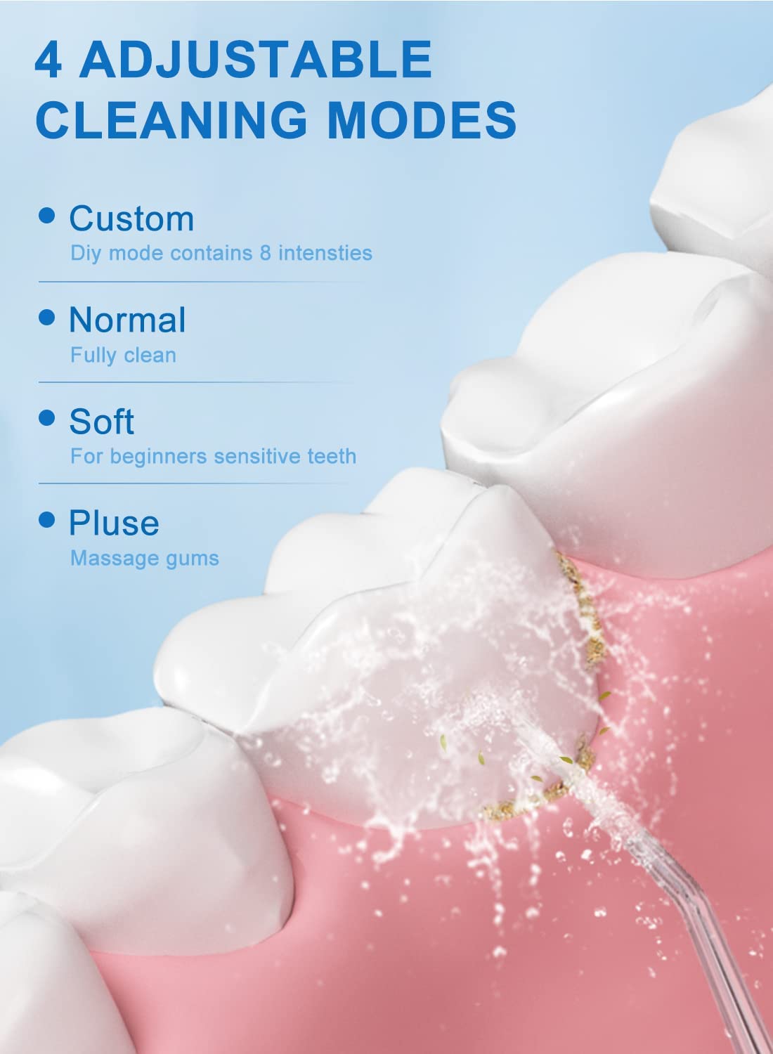 • DEEPER TEETH CLEANING TO IMPROVE GUM STATUS: The water dental flosser handheld features an ergonomic design and upgraded professional pulsation technique, with mouthwash whitening pressure water pulse 1500-1800 times/min, 20-120PSI strong water pressure to effectively removes all the trapped places that traditional flossing can't reach. benefitful for brace and bridge personal toothbrushes care