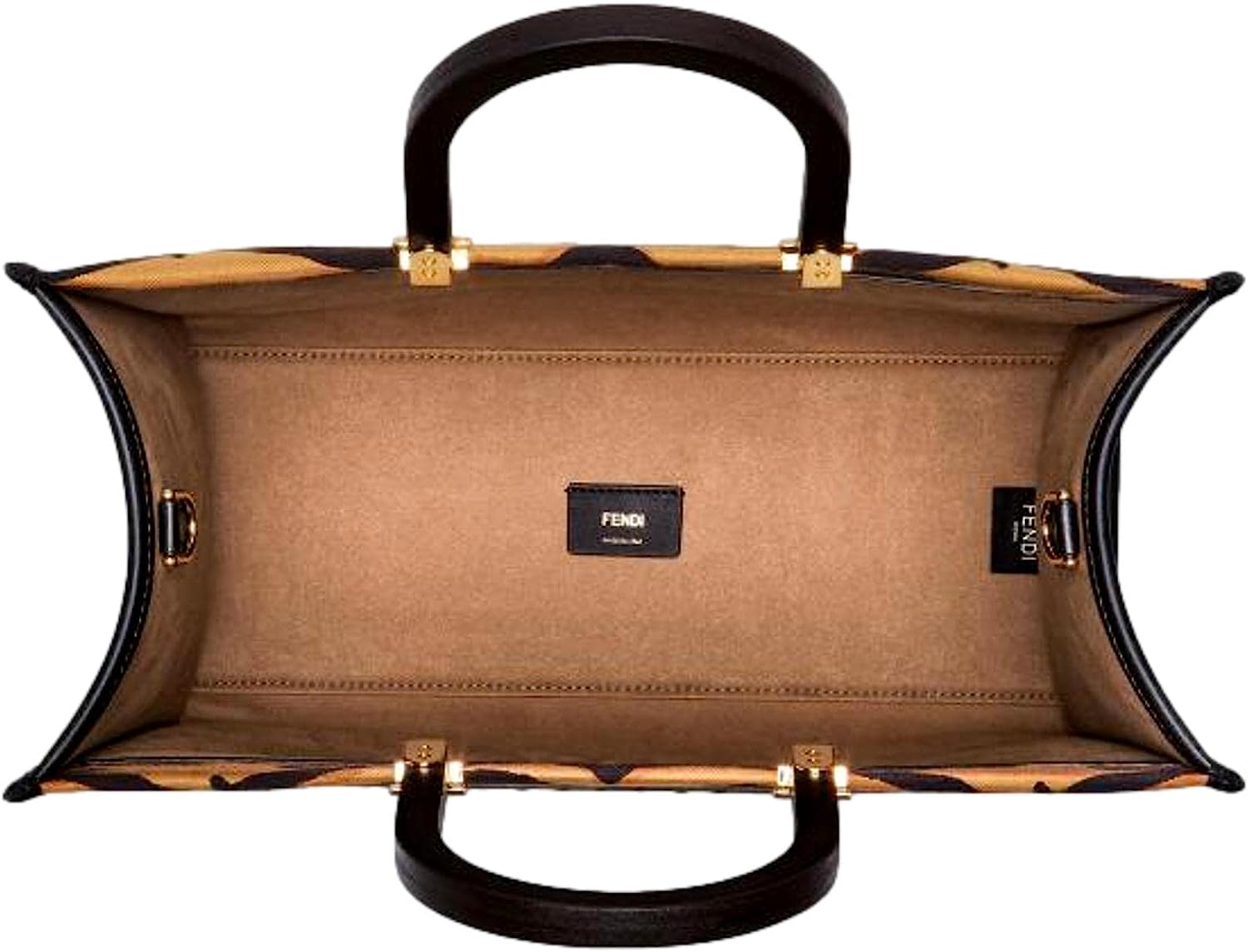 • This Fendi Sunshine Shopper Bag combines classic lines with a bold tiger print in the canvas shopper tote. The designer was inspired by the Chinese Year of the Tiger celebrations and the bold black and yellow colors make the print pop.