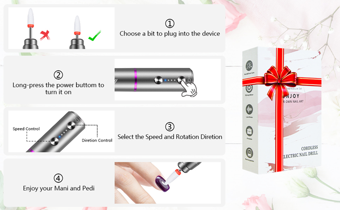 • Adjustable Speed and Direction:The variable speed is 5000-20000RPM,and designed with forward and reverse rotation direction,which makes nail care more easier.