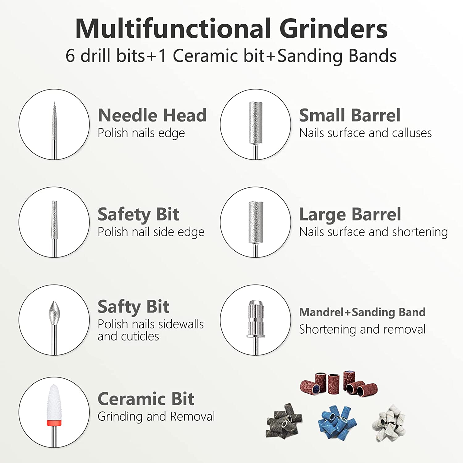 • Professional Electric Nail Drill Set:comes with 6 kinds of metal drill bits and 1ceramic bit,which can meet various manicure and pedicure needs: acrylic nails, gel nails, dip powder nails, cuticle and dead skin, calluses,thick nails.